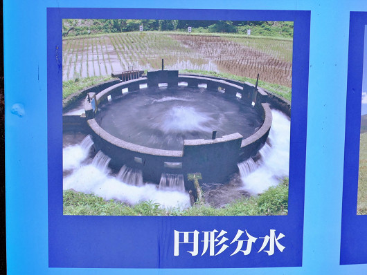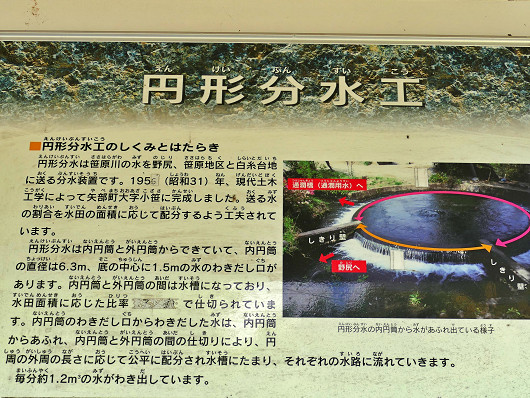 ここには円形分水の説明板もありましたが、説明板には「円形分水工」と書かれていました。円形分水は円筒分水、円筒分水工、円筒分水槽などとも呼ばれているそうです。