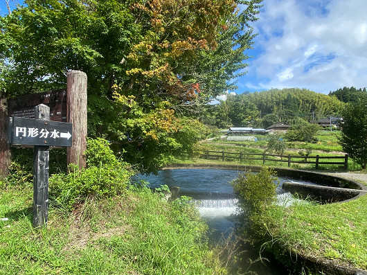 これが竹田市の円形分水です。山都町の円形分水とはちょっと形が違いますが、日本では昔から農業用水の確保のための水争いが絶えなかったので、円形分水のように正確に目に見える形で水を均等に分配できる設備はまさに先人の知恵の結晶といえるでしょうね。