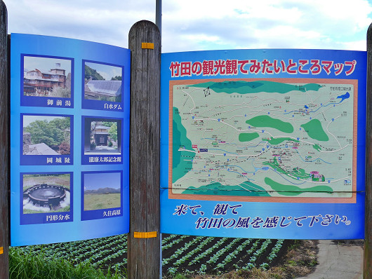 ここからはちょっと余談になりますが、この画像は大分県まで戻ってから休憩をした「道の駅 すごう」で撮影したものですが、ここには竹田市の観光名所の案内板があってその中に円形分水もありました。