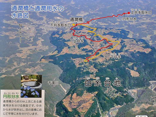 この画像は通潤橋のパンフレットの一部ですが、これを見ると通潤橋の通水管の中を流れている水は、6km上流にある円形分水によって分配された水が流れているようだったので、国道からはちょっと外れますがこの円形分水にも寄ってみました。