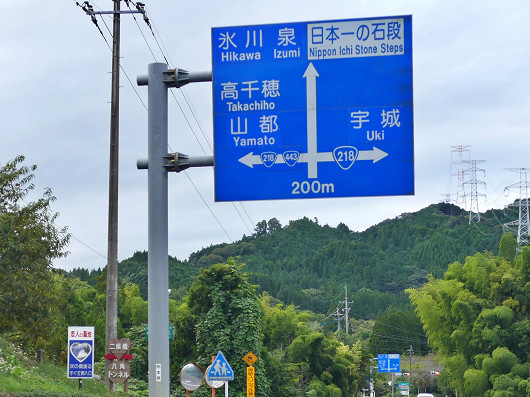 嘉島町のホテルを出発して6㎞ほど進むと国道443号へ出ますが、さらに10㎞ほど進むと甲佐町の中心部を通り過ぎて、頭上にはこの様な標識が見えてきます。ここは昨日訪れた「八角トンネル」への入口で、左下には小さく看板も見えていますが、これから向かうのはここを直進した先にある美里町の「日本一の石段」です。
