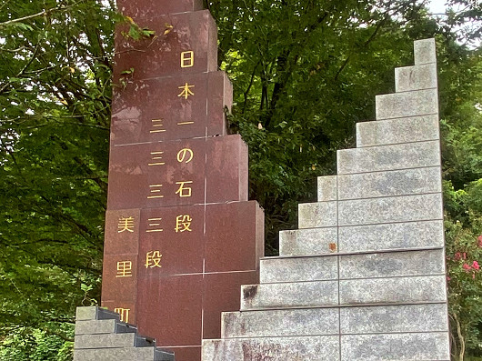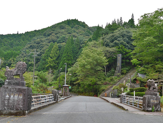 道路沿いに植えられた白い彼岸花をりゅうママと観賞してさらに先へ進むと、小さな橋を渡りますが、欄干部分には一対の狛犬と、その先に石段が見えてきます。ここがこの日最初の目的地で、3333段の日本一の石段です。駐車場は周辺に何ヵ所かありますが、いずれも無人で料金箱にお金を入れるようになっていました。