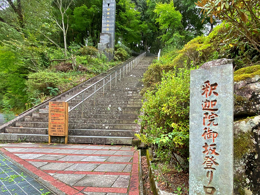 登り口には「釈迦院御坂登り口」と刻まれた石柱もありました。日本一の石段があるのは標高957mの大行寺山で、この石段は山頂近くの釈迦院という寺院の手前まで続く表参道ですが、釈迦院の所在地は八代市で、石段があるのは下益城郡(しもましきぐん)美里町なんですよね。