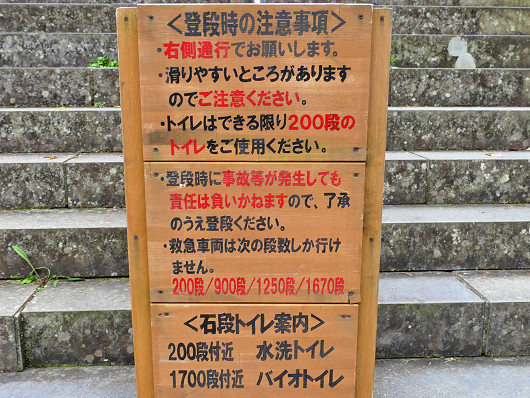 石段の登り口にはこの様な注意書きもありました。1700段を過ぎたらもうトイレが無いので水分の採り過ぎは厳禁ですね(笑)