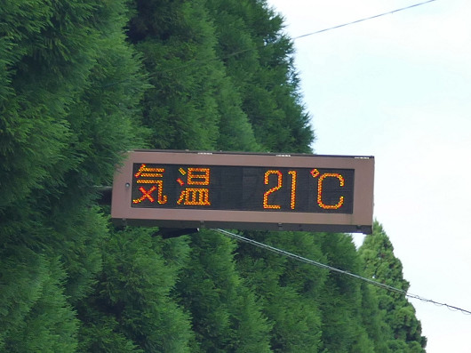 まだ日中は真夏並みの暑い日が続いていますが、竹田市街地を抜けた道路上にある電光表示板は気温21℃を表示していました。先月ここを通った時には27℃を表示していたので、いくらか秋が近づいているような感じですね。