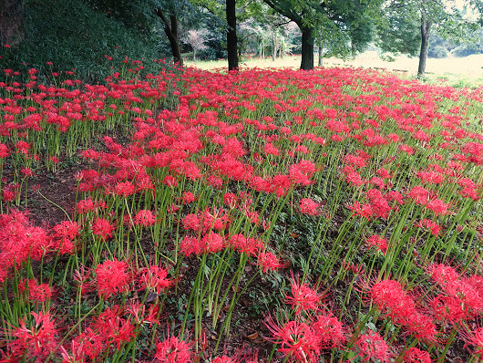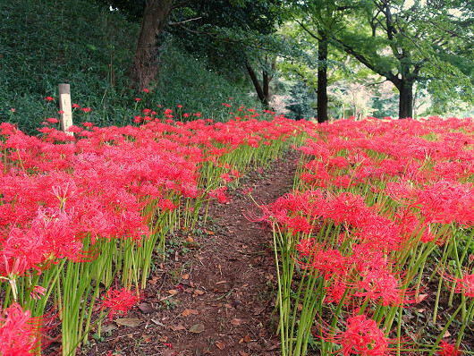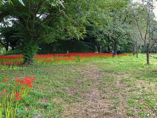 先月ここを訪れた時にはキツネノカミソリが満開でしたが、この時季は20万本ともいわれている彼岸花が見頃を迎えます。車を停めて古墳へ向かうとたくさんの彼岸花が咲いていましたが、手前のほうには全く彼岸花がありませんでした。以前はこの辺りを含めて一面に彼岸花が咲いていたような気がするんですが気のせいでしょうか?