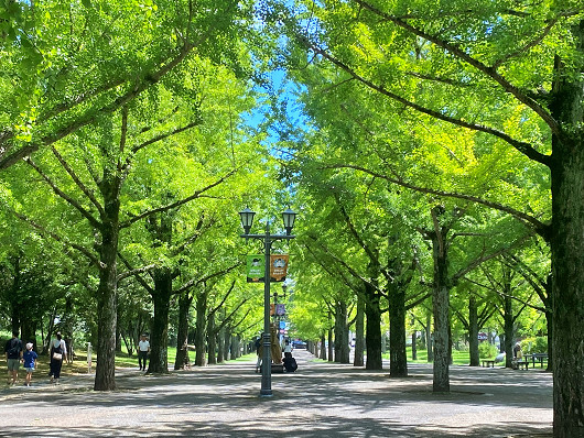 県庁前の県庁プロムナードはイチョウ並木になっていて、肥後藩54万石にちなんで54本のイチョウが植えられているそうです。今はまだ青々としているイチョウの葉ですが、秋にはライトアップもされるようなので、黄金色の見事な景色を見ることができるでしょうね。