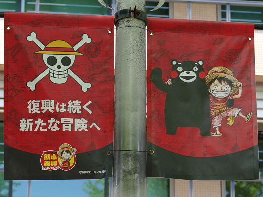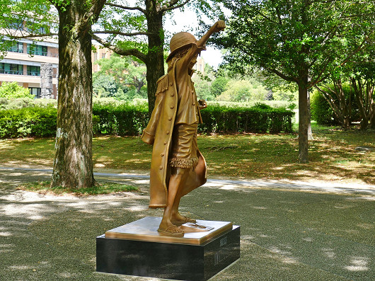 麦わらの一味は全員で10人いますが、熊本市出身でワンピース作者の尾田栄一郎さんや集英社の協力で、麦わらの一味船長のルフィ像が他の仲間に先駆けて、2018年11月にここに建てられたそうです。その後各被災地に順次仲間の像が建てられて、最後の10人目になるジンベエ像は今年の7月に宇土市の住吉海岸公園に建てられました。