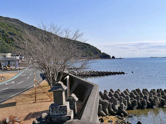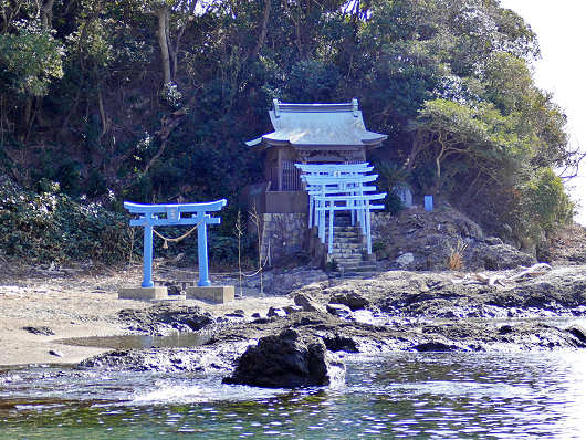 波打ち際の流木を避けながら慎重に歩いて、ようやく鳥居の前までやって来ました。このすぐ近くには県道から降りる道があって、2~3台の車も停められるようでした。