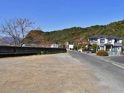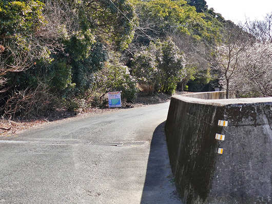 常夜灯の台座部分に登って眺めた海側の景色です。これから向かうのは奥のほうに見える岬の先端部です。県道212号のこの辺りは片側一車線の立派な道路が岬へ向かって伸びていますが・・・