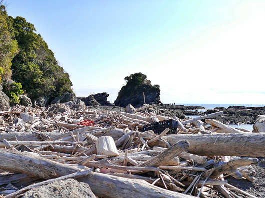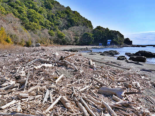 波打ち際を歩き始めると、いきなり多量の流木が積み重なっていました。そして岬の先端部には青い鳥居をした小さな神社が見えました。この神社が次の目的地です。