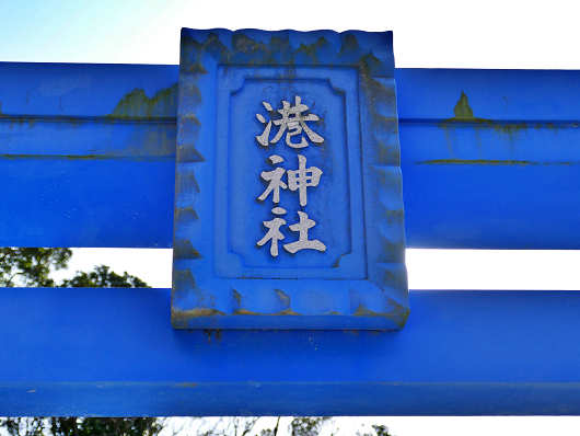 望遠で眺めた青い鳥居の神社です。この神社は波打ち際ギリギリの岩場に建っていて、海が荒れた時には波に洗われそうな位置にありました。