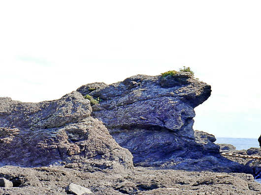 流木だらけで近寄れなかった大岩を望遠で撮影するとこの様な姿をしていて、地元ではその姿から「かえる岩」と呼ばれているそうです。