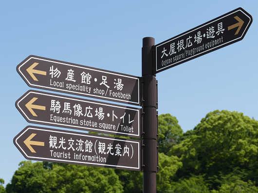 駐車場に車を停めたらまずは物産館へと向かいましたが、途中にはこの様な案内標識があって、物産館や観光案内所の他にもいくつかの施設があります。ここは菊池市の中心部にあるので、菊池市民の憩いの場にもなっているんでしょうね。