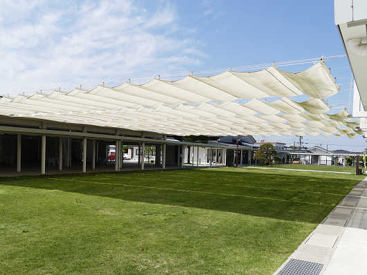 足湯は画像の奥のほうにありますが、左側には観光交流館と、屋根の下にイスとテーブルが置かれた広大なテラス席のような感じの大屋根広場があって、右側に観光物産館の建物があります。両方の建物の間にある芝生広場には、日陰になるようにシート状のものが掛けられていたので、これからの季節はここで寛いだり、お弁当を食べるのも良さそうですね。