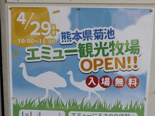 この時は「菊池観光交流館」の館内へは入りませんでしたが、入口には「エミュー観光牧場 OPEN 入場無料」と書かれたポスターがありました。ここはまだオープンする前の昨年10月に、20羽のエミューの脱走が全国ニュースで流されて一躍有名になったところですが、今年のGWにはすでにオープンしていたんですね。