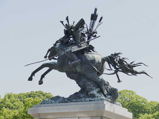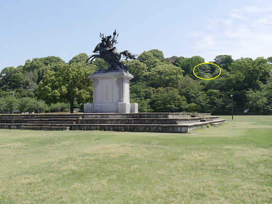 物産館の横は広大な芝生広場になっていて、その中央には南北朝時代の名将「菊池武光」の銅像が建っています。菊池武光の銅像は菊池神社にもありましたが、ここに建っている像はかなり巨大でした。ちなみに菊池武光などを祀っている菊池神社は画像の黄色い丸印のところにあります。